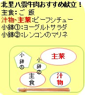 【北里八雲牛肉ときのこのビーフシチュー】 材料4人分(エネルギー1914kcal、たんぱく質48.0g 塩分相当量11.2g) 北里八雲牛肉(バラまたはすき焼き用)…200g、 バター…10g、玉ねぎ…中1個、人参…1本半、じゃが芋(大)…2個、しめじ…1パック、 マッシュルーム(水煮缶)…1缶、水…300ml、デミグラスソース…1缶、赤ワイン…100ml、 コンソメ(固形)…2個、トマトケチャップ…大さじ2杯、塩…少々、 <作り方> ①玉ねぎは、くし切り、人参とじゃが芋は、一口大の乱切りにし、しめじは石づきを取り、 ほぐしておく。 ②熱した鍋に半分の量のバターを入れ、牛肉に火が通るまで炒める。火が通ったら 容器に移しておく。 ③残りのバターを鍋に入れ、玉ねぎを加え、玉ねぎがしんなりするまで炒める。次に、 人参とじゃが芋、しめじも入れ5分程炒めた後、②の牛肉とマッシュルーム鍋に戻し、 水を入れ20分程煮込む。 ④煮込んだ鍋に、赤ワインと、なめらかに ほぐしたデミグラスソースを入れ煮詰める。 ⑤煮詰めたら、砕いたコンソメと、ケチャップを入れて塩で味を整えたら完成。 秋に旬のきのこを多く使用することで季節を感じることが出来ます。お好みの 秋の具材を入れて好みのビーフシチューにしてみて下さい。