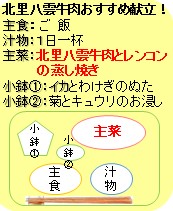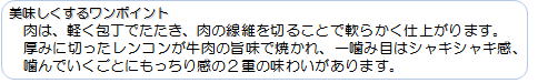 【北里八雲牛肉とレンコンの蒸し焼き】 材料4人分:1人5個の栄養価(エネルギー230kcal、たんぱく質9g 塩分相当量2.3g) 北里八雲牛肉 焼き肉用…200g 、 肉の下味:塩…1つまみ、コショウ…少々 レンコン…12㎝長さ中2個(1個150g程度 20枚に切る)、 サラダ油…小さじ1(使わなくてもよい。)、水…適量(1回の焼きで約50m)、 大根おろし…300g、ポン酢醤油…100ml、 長ねぎ …4本、 <作り方> ①焼き肉用北里八雲牛肉を、軽く包丁の歯でたたいておく。1つまみの塩、コショウで、肉に下味をつける。 ②レンコンは皮をむき、1㎝の厚さの輪切りにする。 ③中火でフライパンを温め、サラダ油を入れ、②のレンコンが重ならない様フライパン に並べる。(直径28㎝のフライパンで、1回に10枚のレンコンが並べられました。) ④レンコンを並び終えたら、輪切りレンコン1枚につき、①の焼き肉用牛肉を1~2枚、 広げて乗せる。 ⑤火加減を弱火にし、水を加え(レンコンが数mm水に浸る程度)フライパンに蓋をする。 15分程 蒸し焼きにする。 ⑥レンコンに美味しそうな焦げ目(醤油の様な色)がついたら 出来上がり。 大根おろし、ポン酢醤油、長ねぎを添えてお召し上がりください。